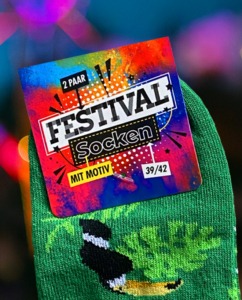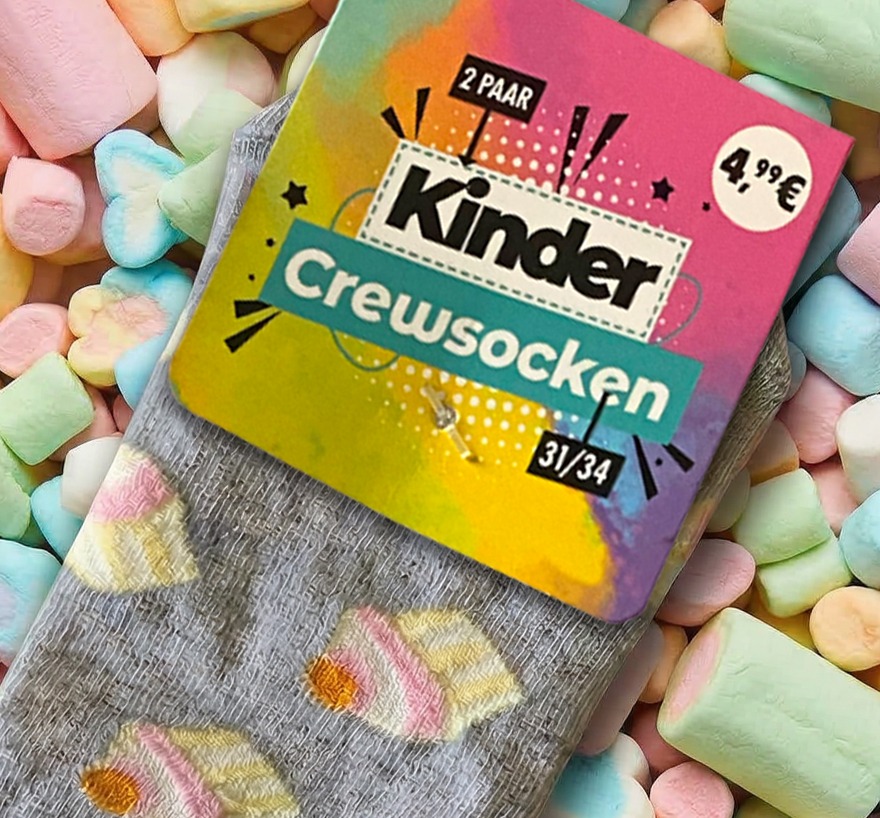 Produktfotografie von zwei verpackten Sneakersocken mit österlichen Motiven. Türkis mit Ei udn Hasenohren und Bunt mit Küken das eine Sonnenbrille trägt. Frophe Ostern als Aufschrift.